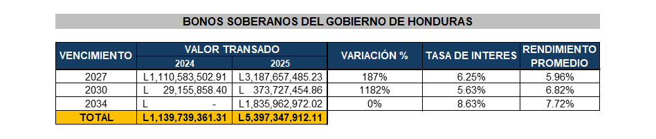 Se ha negociado un monto récord de L 5,397,347,912.11, lo que representa un crecimiento del 374%, reflejando el marcado apetito de los inversionistas por este tipo de instrumentos. Este interés se ve reforzado por el entorno internacional, ya que, de continuar la reducción de las tasas de interés por parte de la Reserva Federal (FED), los precios de estos bonos podrían seguir mostrando una tendencia al alza.