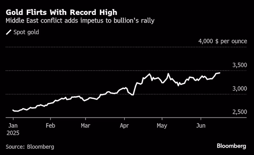 El oro continúa su camino alcista y se mantiene cerca de sus máximos históricos, en un contexto marcado por el aumento de las tensiones entre Israel e Irán, lo que ha llevado a los inversionistas a buscar activos refugio. Durante la jornada asiática, el metal precioso alcanzó un alza de hasta 0.6%, acercándose a los 3,450 dólares por onza, apenas 50 dólares por debajo del récord establecido en abril.